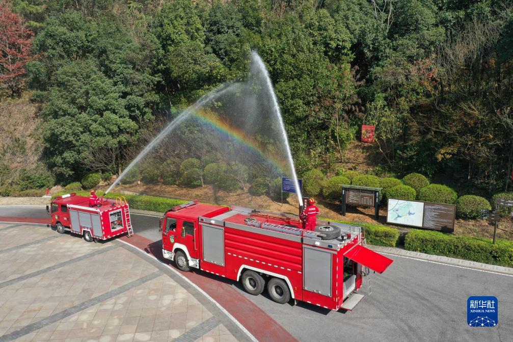 12月7日,在長沙岳麓山風景名勝區桃花嶺景區,森林消防員在演練中向模擬起火點噴水(無人機照片)。