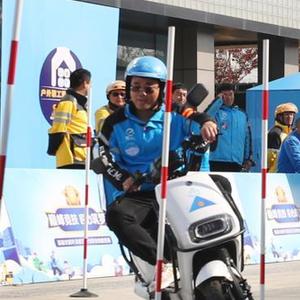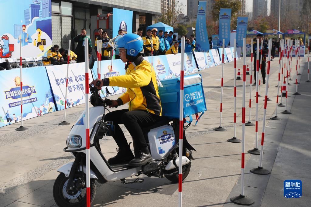 12月7日,一名配送員在比賽中進行電瓶車繞樁騎行。