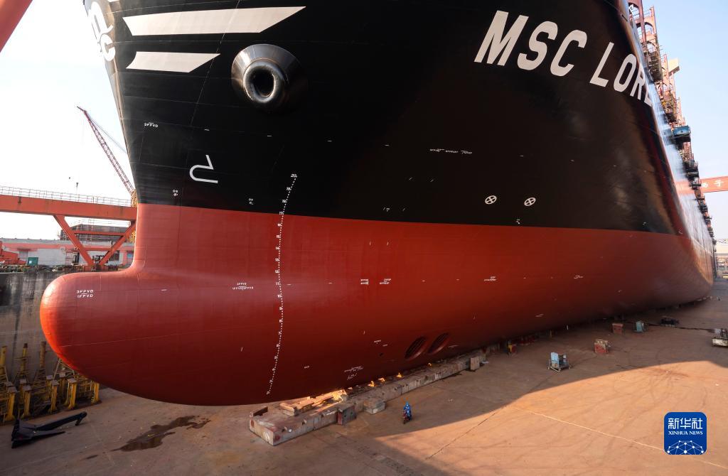 12月5日,在位于江蘇省泰興市的江蘇揚子鑫福造船有限公司船塢內,一名工人從一艘集裝箱船旁走過。