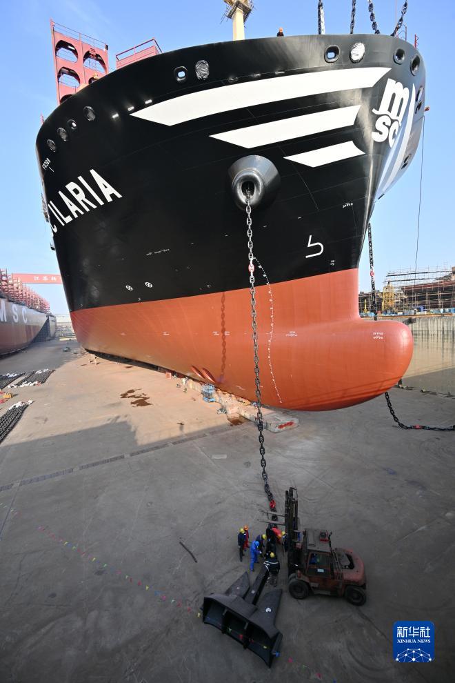 12月5日,在位于江蘇省泰興市的江蘇揚子鑫福造船有限公司船塢內,工人為一艘即將出塢的集裝箱船安裝船錨。