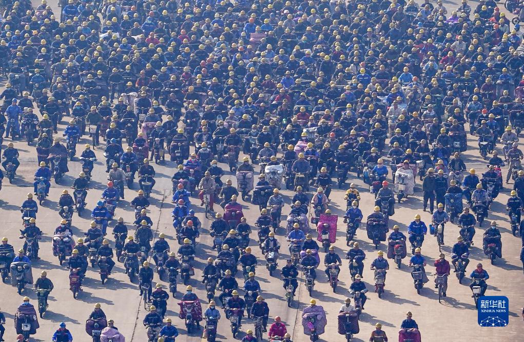 12月5日,在位于江蘇省泰興市的江蘇揚子鑫福造船有限公司,工人在中午下班時騎車離開廠區(無人機照片)。
