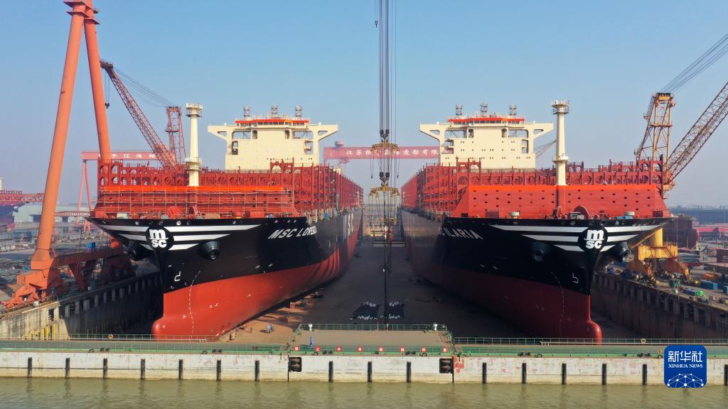 12月5日在江蘇省泰興市的江蘇揚子鑫福造船有限公司拍攝的兩艘即將出塢的集裝箱船(無人機照片)。