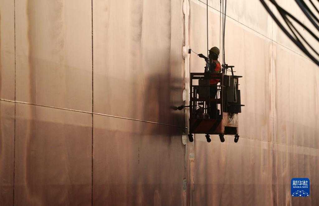 12月5日,在位于江蘇省泰興市的江蘇揚子鑫福造船有限公司,工人在船塢內為一艘集裝箱船刷漆。