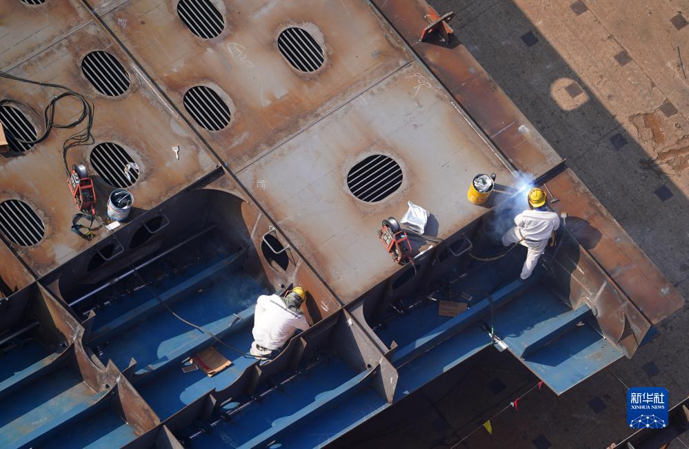 12月5日,在位于江蘇省泰興市的江蘇揚子鑫福造船有限公司,工人在集裝箱船的零部件上作業。