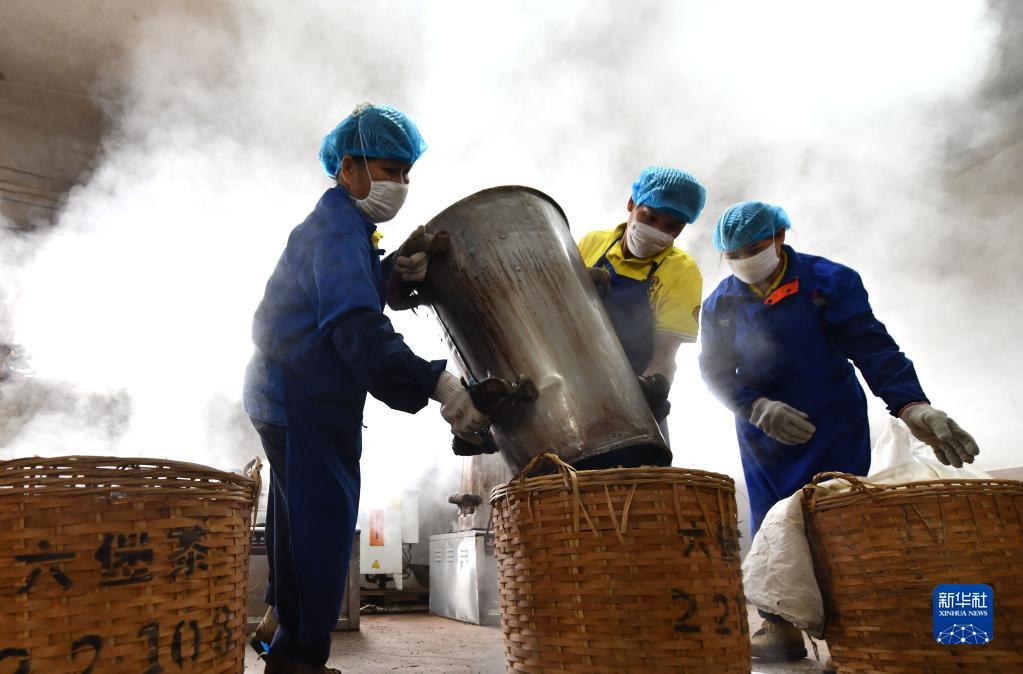 在梧州市中茗茶業有限公司,工人在蒸茶、壓筐(11月29日攝)。