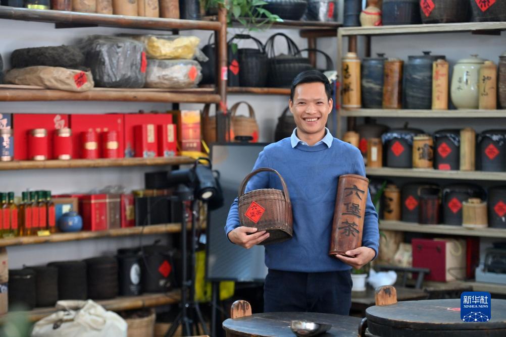 在梧州市蒼梧縣大澤六堡茶業有限公司,六堡茶制作技藝非遺傳承人韋湛生展示六堡茶(12月5日攝)。