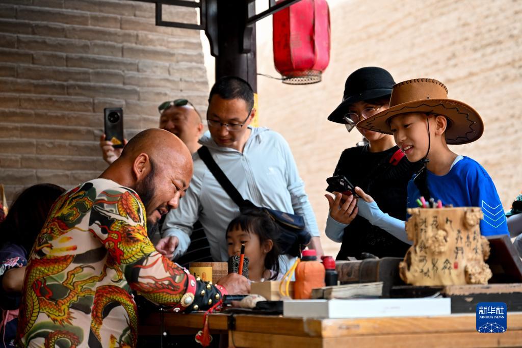 7月14日,在甘肅嘉峪關關城景區,游客在攤位前觀看李森手寫文創產品“關照”。