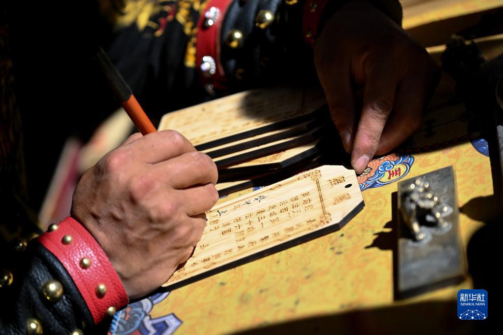 7月13日,在甘肅嘉峪關關城景區,李森為游客手寫文創產品“關照”。