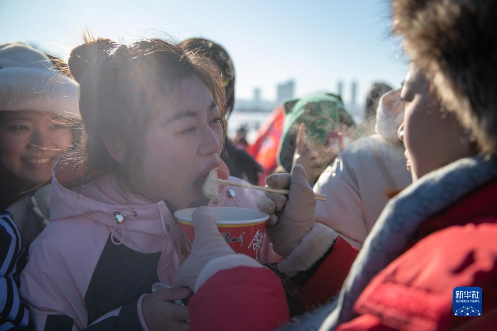 12月7日,市民在第四屆哈爾濱采冰節活動現場品嘗餃子。