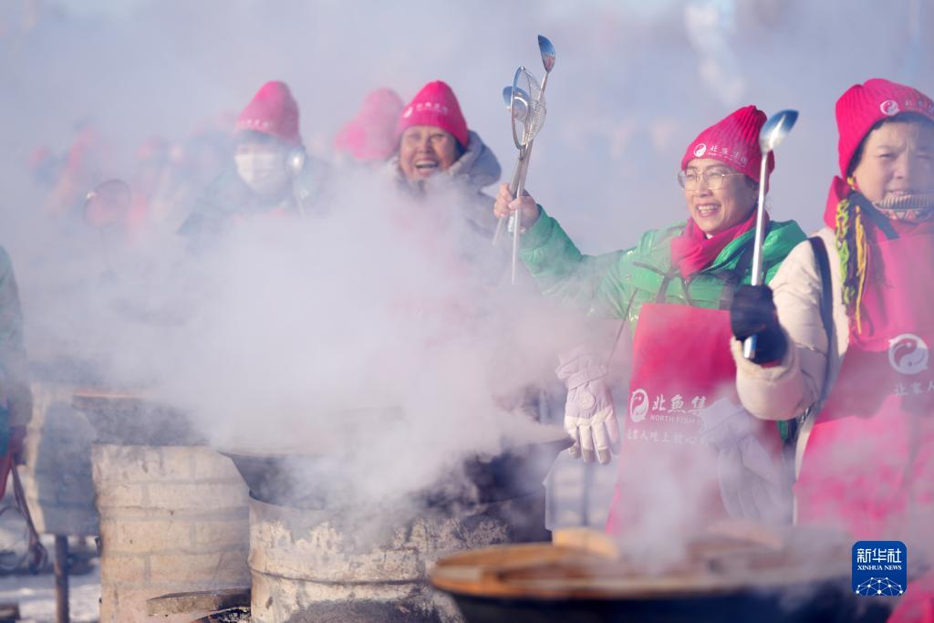 12月7日,在采冰節活動現場,工作人員用大鐵鍋做江水燉江魚。