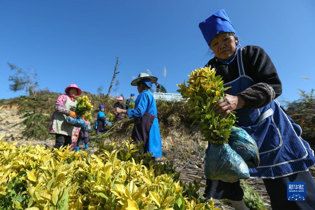 12月7日,茶農在貴州省黔東南苗族侗族自治州丹寨縣揚武鎮老冬村烏仲茶葉種植基地搬運茶苗。