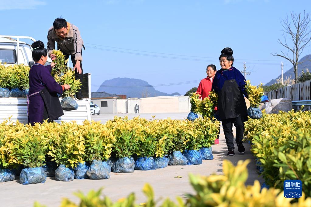 12月7日,工作人員在貴州省黔東南苗族侗族自治州丹寨縣一家茶企搬運茶苗。