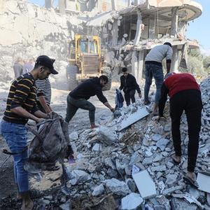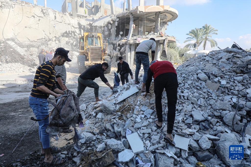 12月6日,在加沙地帶代爾拜拉赫,人們查看以軍空襲后的廢墟。