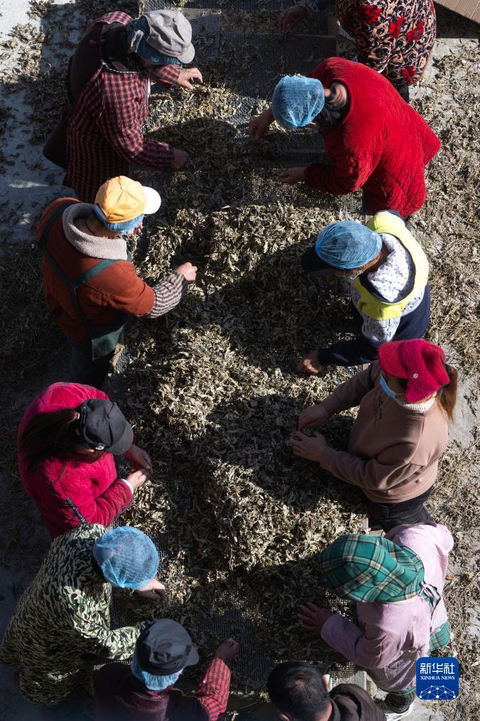 12月7日,在蘄春縣石馬山村的就業幫扶車間,工人在對蘄艾進行初加工。