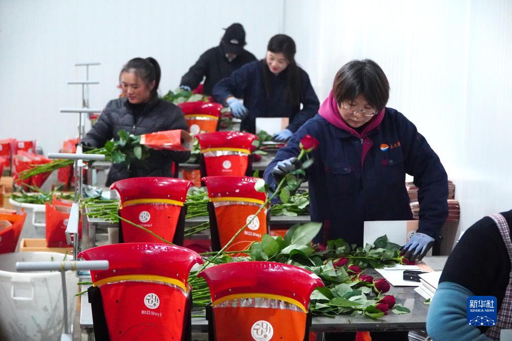 12月7日,在山東省新泰市樓德鎮,工作人員在加工剛采摘的玫瑰。