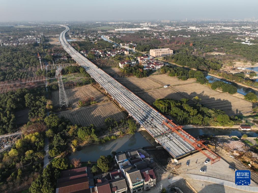 這是蘇臺高速公路七都至桃源段ST-QL5標主線橋梁架設現場(12月7日攝,無人機照片)。