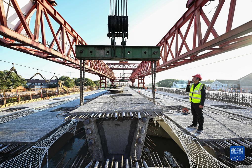 12月7日,中鐵二十局工作人員在蘇臺高速公路七都至桃源段ST-QL5標主線橋梁架設現場指揮。