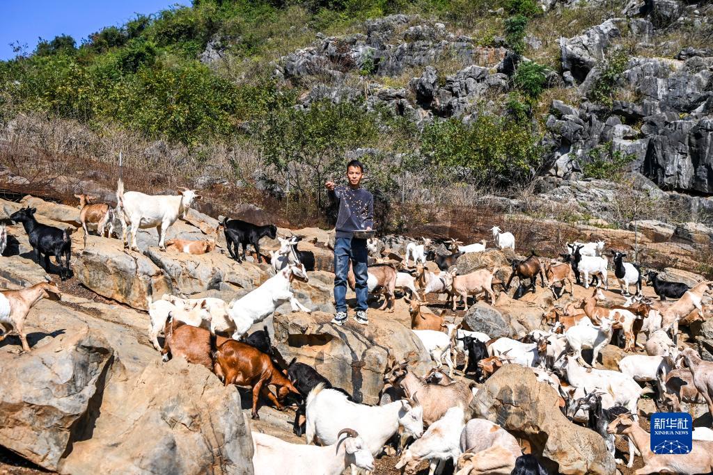 12月7日,在廣西鐘山縣一處山羊養殖基地,村民在給山羊喂食。