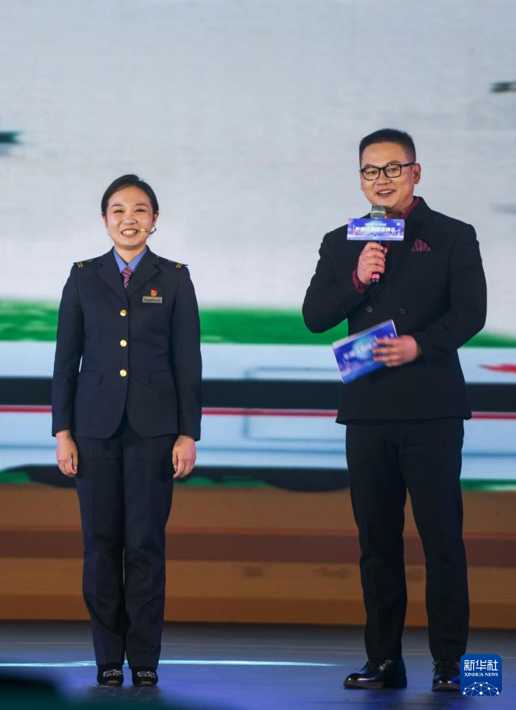 1月4日,由新華社主辦的“中國網事·感動2023”年度人物頒獎典禮在武漢舉行。這是暴雨中的硬核“鐵路藍”趙陽(左)出席頒獎典禮。
