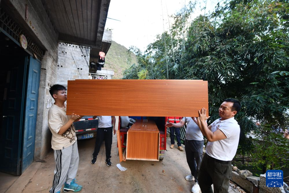 2024年2月2日,在廣西靖西市祿峒鎮思侯村,周克兵(右)和兒子周福金將新買的家具搬進老家。