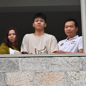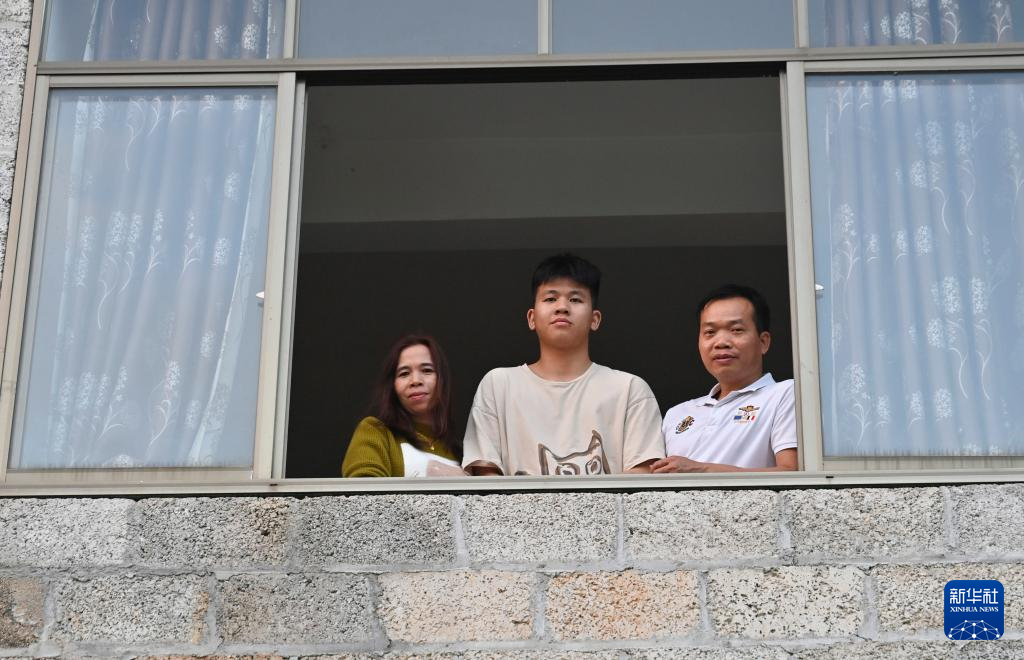 2024年2月2日,在廣西靖西市祿峒鎮思侯村,周克兵(右)和妻兒站在老家的窗前。