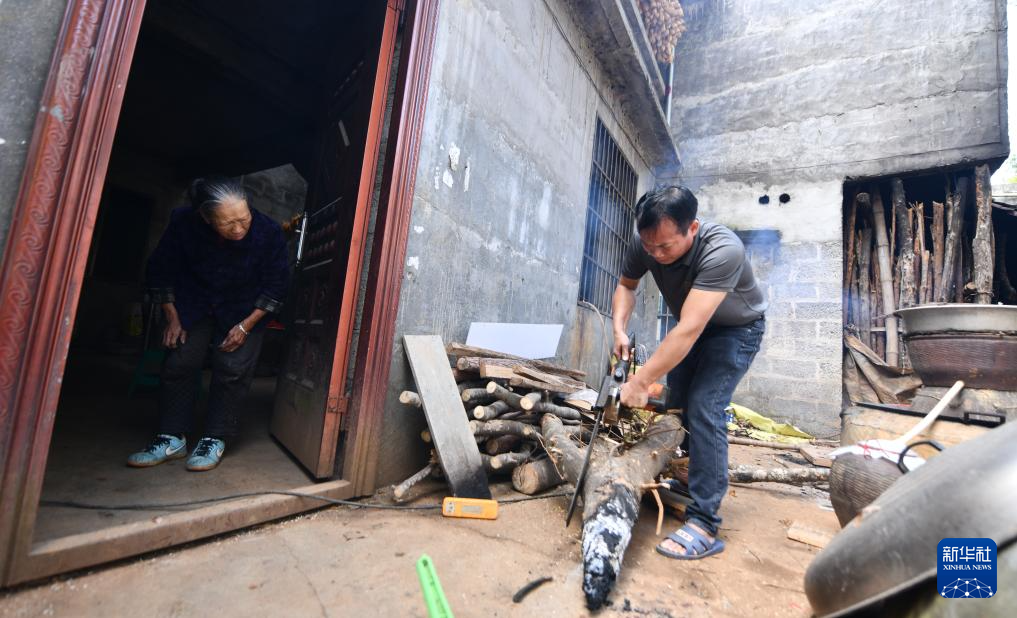 2024年2月3日,在廣西靖西市祿峒鎮思侯村,周克兵的母親周母勝(左)在看兒子做家務。