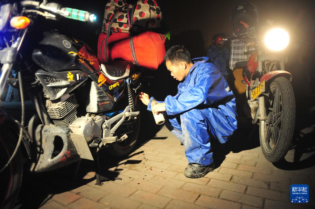 2013年2月4日清晨,在廣西賓陽縣城,周克兵檢查摩托車的車況,準備繼續上路。