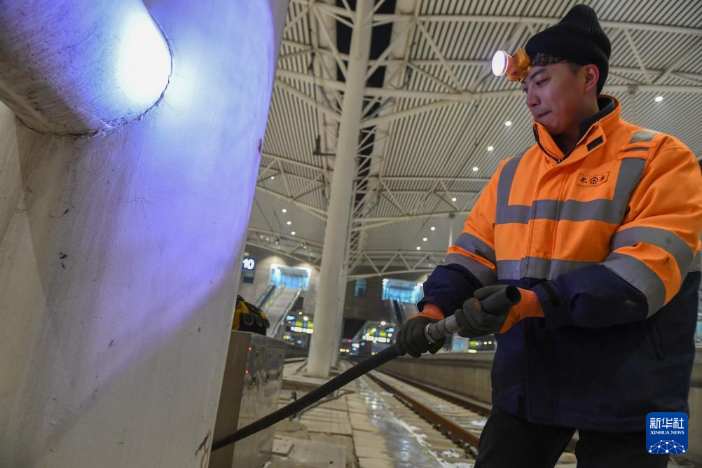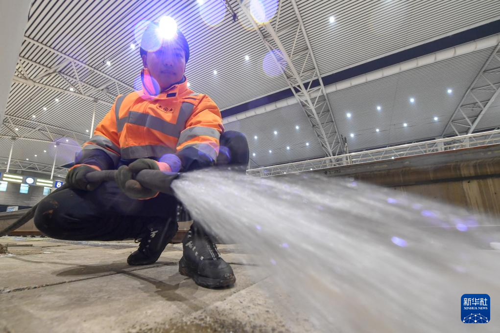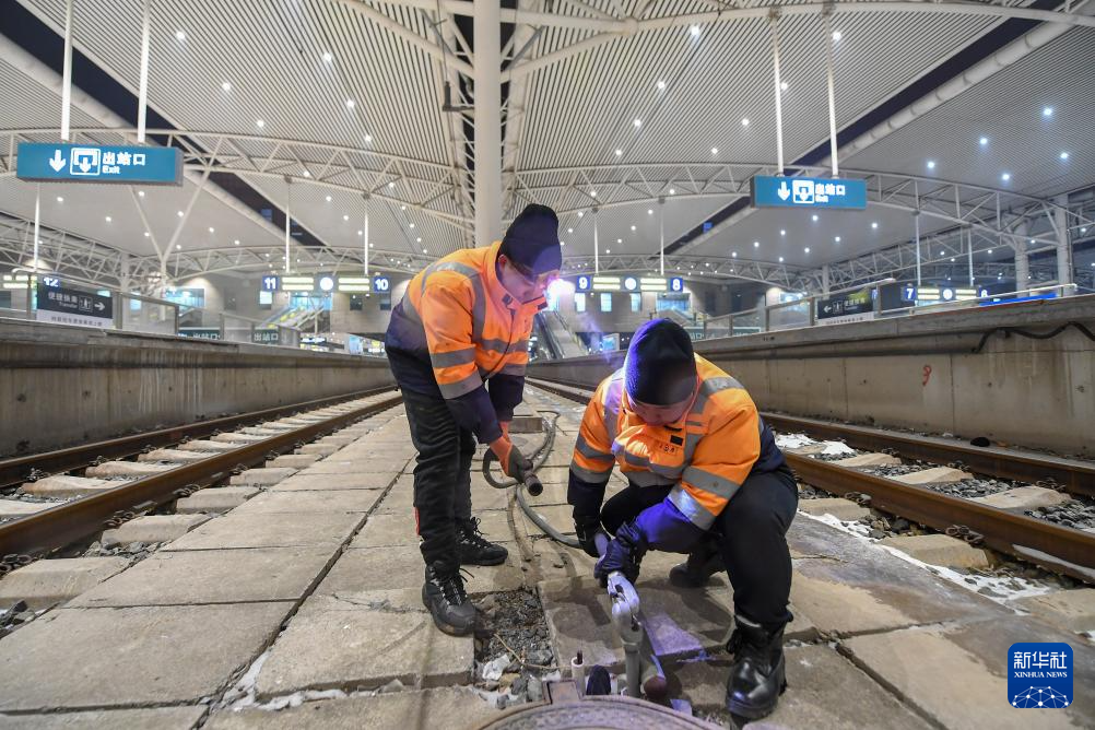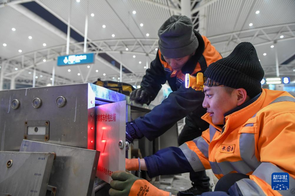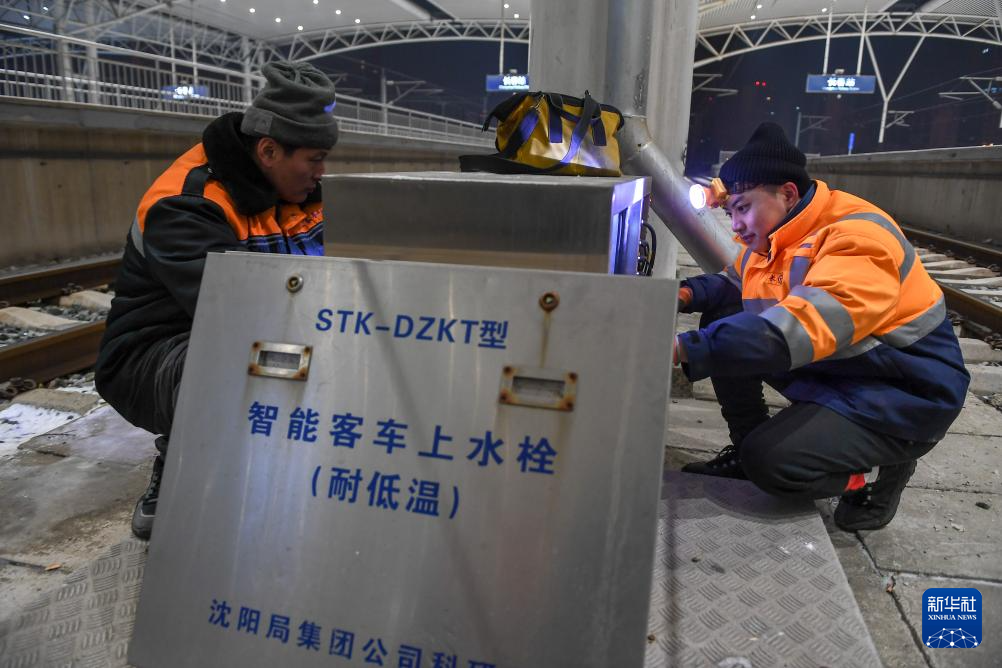 2月6日凌晨,龐偉強(右)和同事齊加東在長春站檢修智能客車上水栓控制系統。
