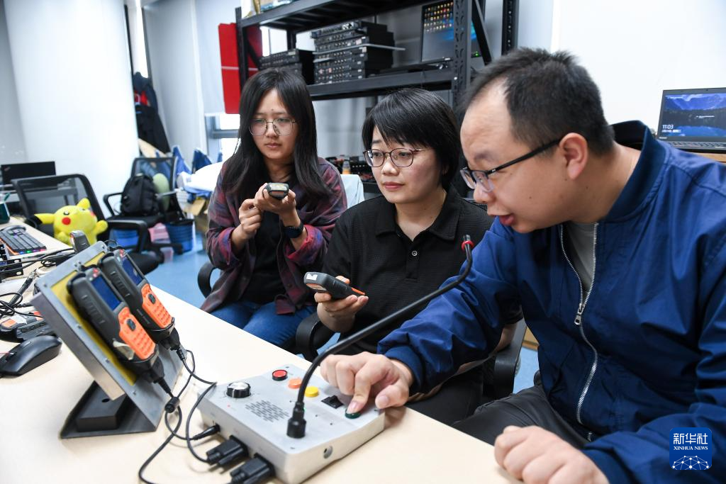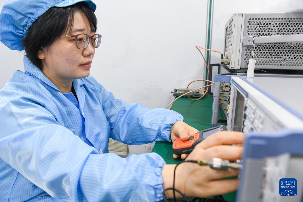 陳淑賢在實驗室屏蔽房使用綜測儀進行小區廣播功能測試(2月20日攝)。