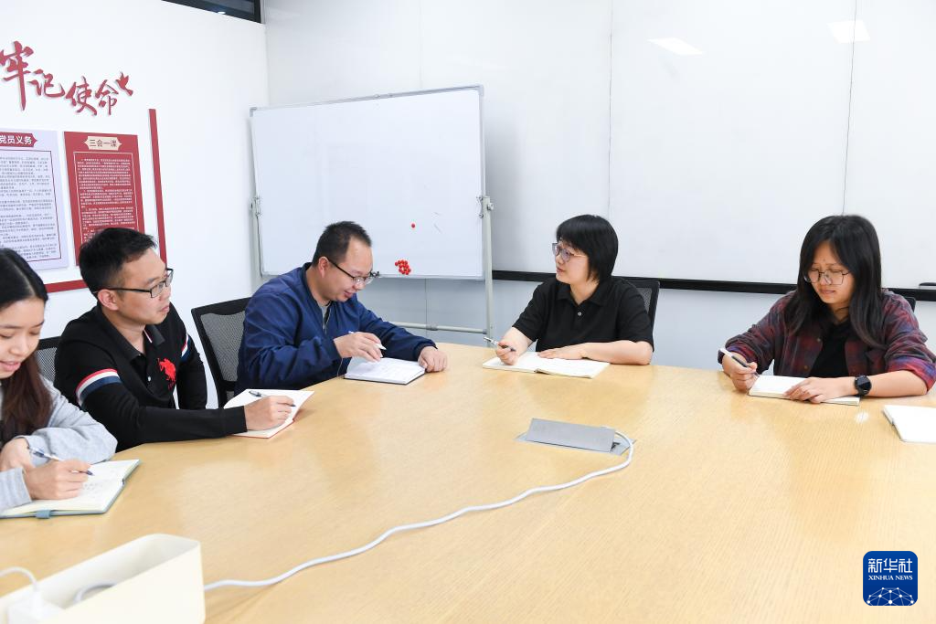 陳淑賢(右二)在辦公室與部門同事開會時交流(2月20日攝)。