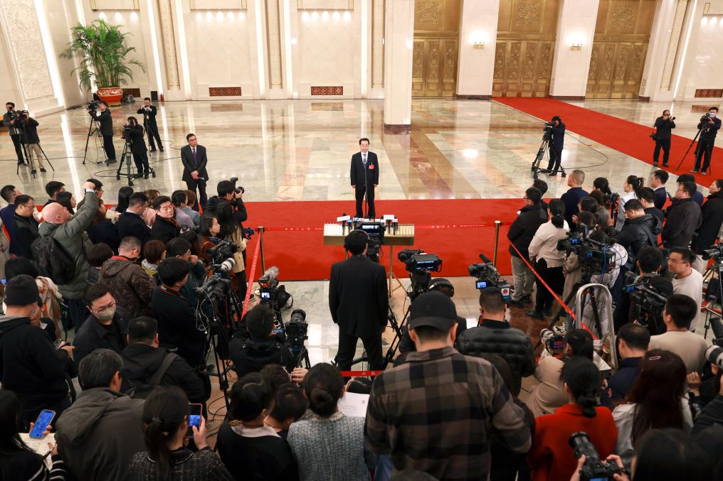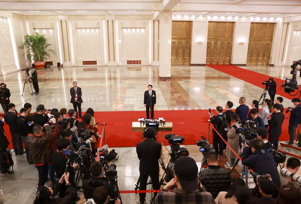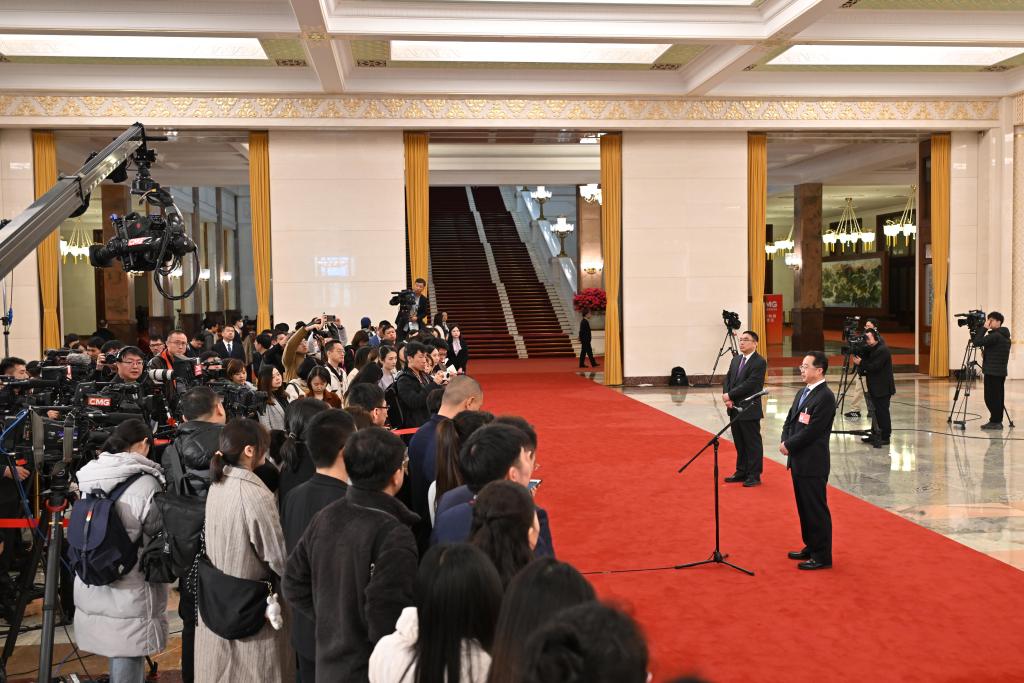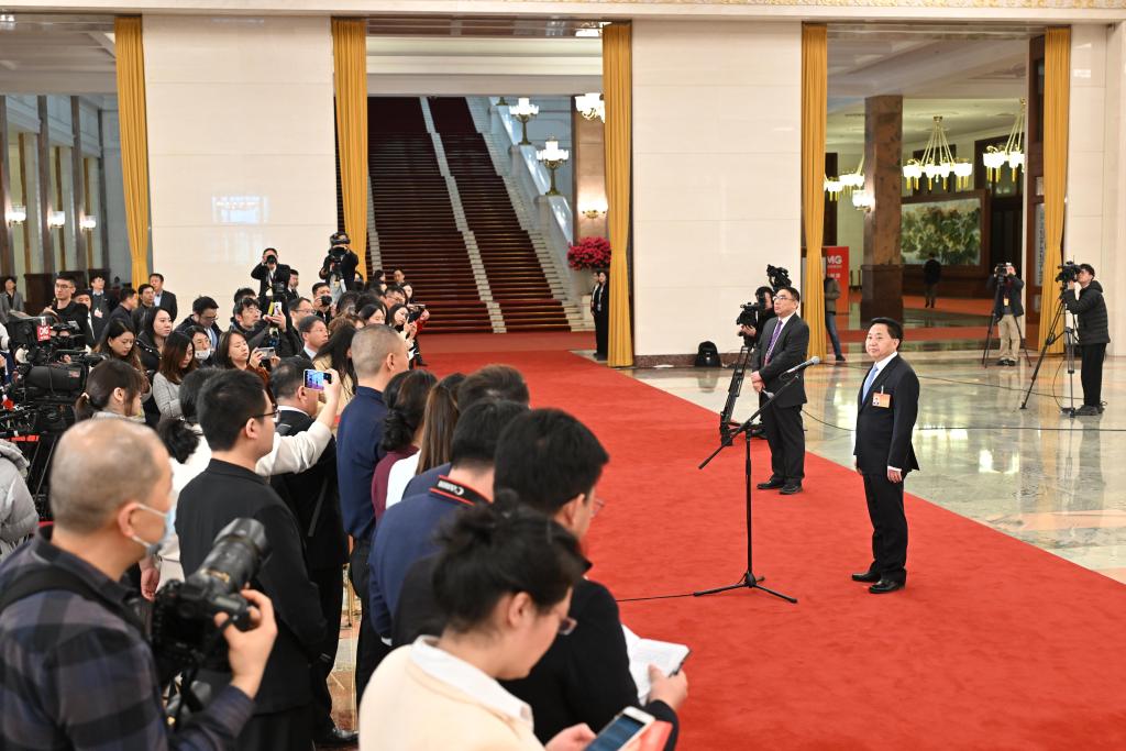 3月8日,第十四屆全國人民代表大會第二次會議第二場“部長通道”集中采訪活動在北京人民大會堂舉行。這是記者在現場采訪。