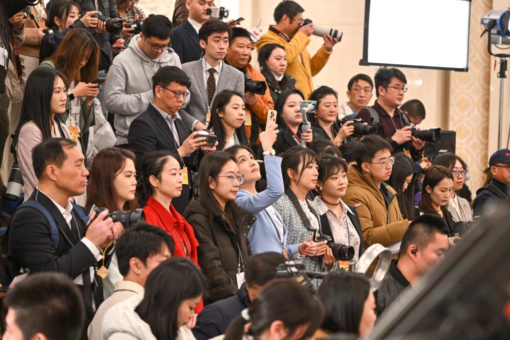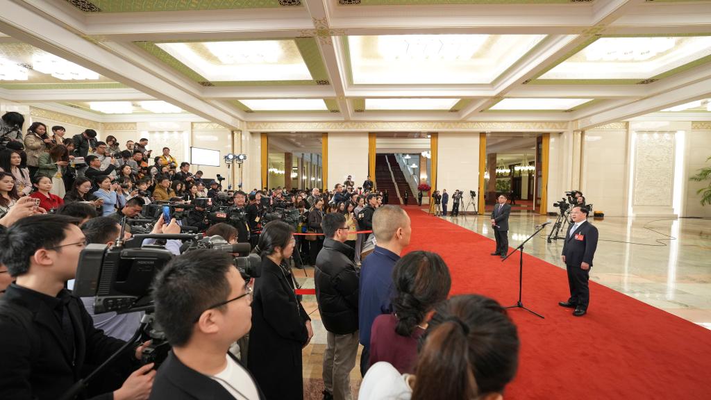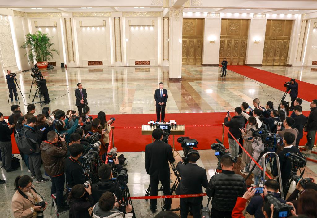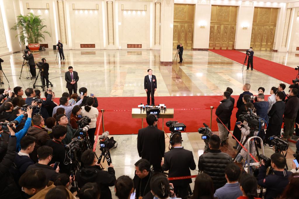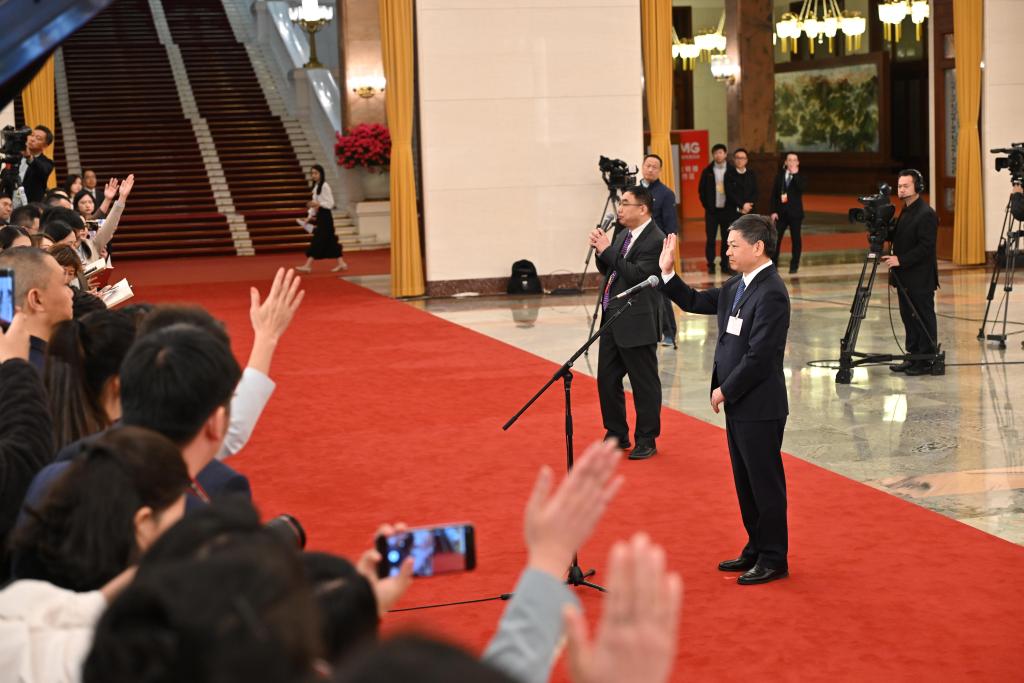 3月8日,第十四屆全國人民代表大會第二次會議第二場“部長通道”集中采訪活動在北京人民大會堂舉行。這是記者在現場采訪。