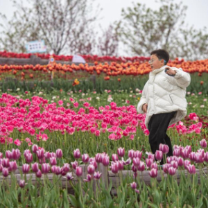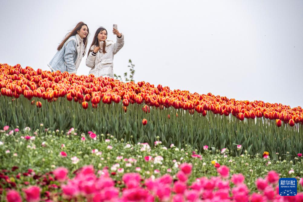 3月8日,在位于重慶市大渡口區跳蹬鎮金鰲村的云上田園景區內,游客在郁金香花海里拍照。