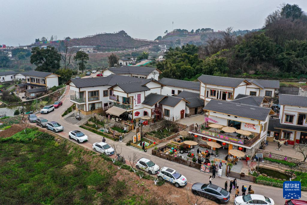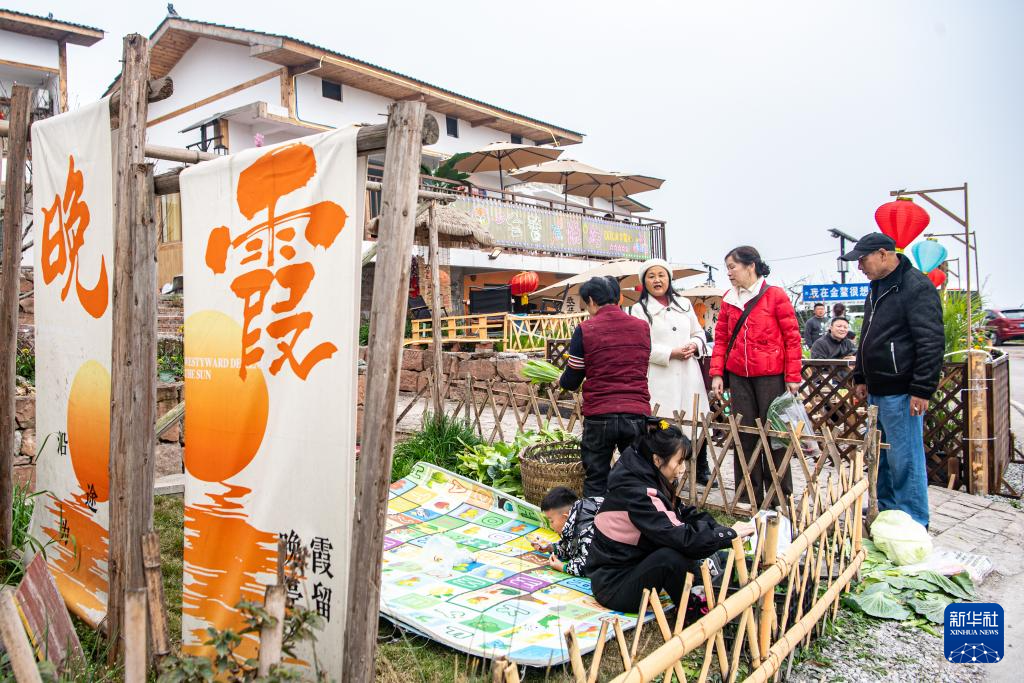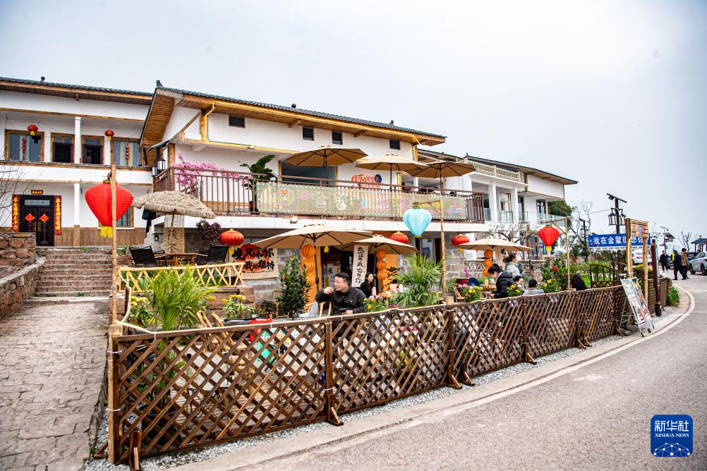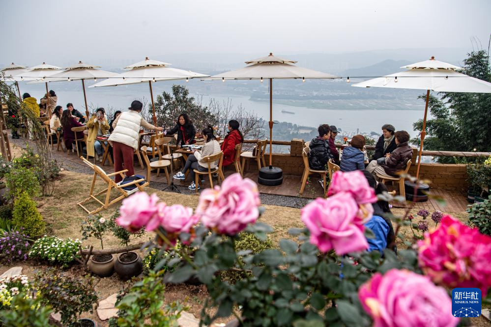 3月8日,在重慶市大渡口區跳蹬鎮金鰲村,游客在改造后的農家小院內觀江景。