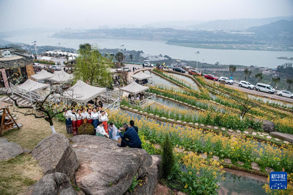 3月8日,在重慶市大渡口區跳蹬鎮石盤村,游客在山水田園間拍照。