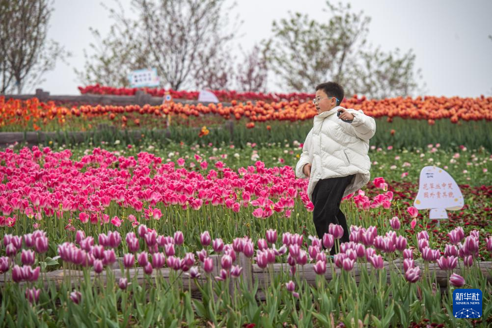 3月8日,在位于重慶市大渡口區跳蹬鎮金鰲村的云上田園景區內,小朋友在郁金香花海里奔跑。