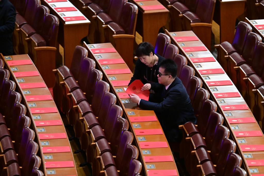3月11日,第十四屆全國人民代表大會第二次會議在北京人民大會堂舉行閉幕會。這是閉幕會開始前,盲人代表王永澄(右)早早來到會場熟悉大會材料。