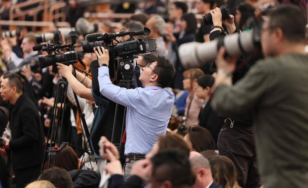3月11日,第十四屆全國人民代表大會第二次會議在北京人民大會堂舉行閉幕會。這是記者在閉幕會上采訪。
