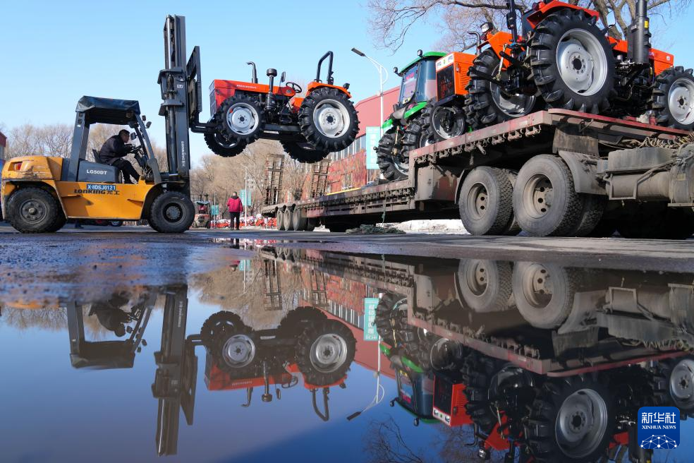 3月12日,在佳木斯驥馳拖拉機制造有限公司大院,工作人員用叉車向運輸車上搬運拖拉機。