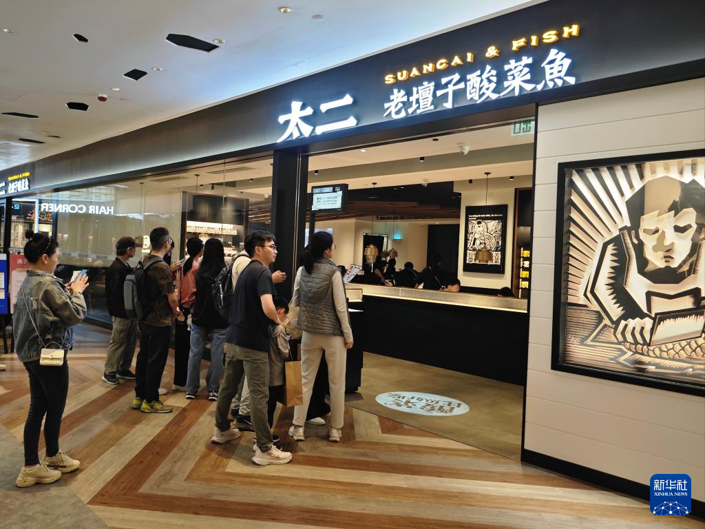 3月23日,在太二酸菜魚位于尖沙咀一商場內的門店外,顧客排隊等候進店用餐。