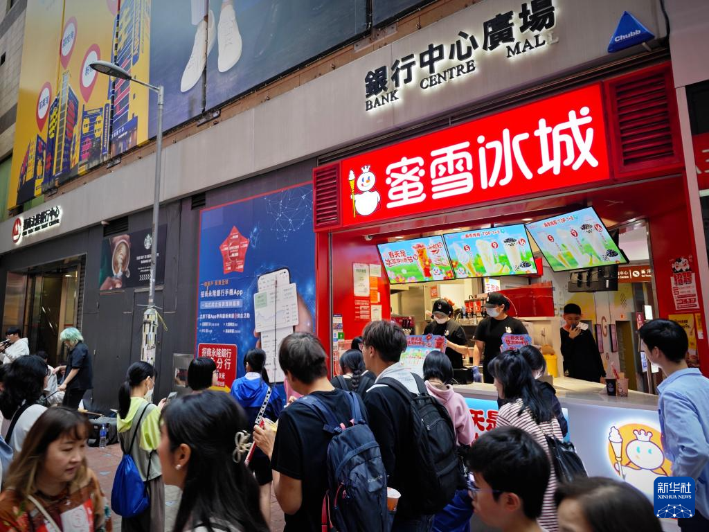3月23日,在蜜雪冰城位于旺角的一家門店外,顧客排隊等候點餐。