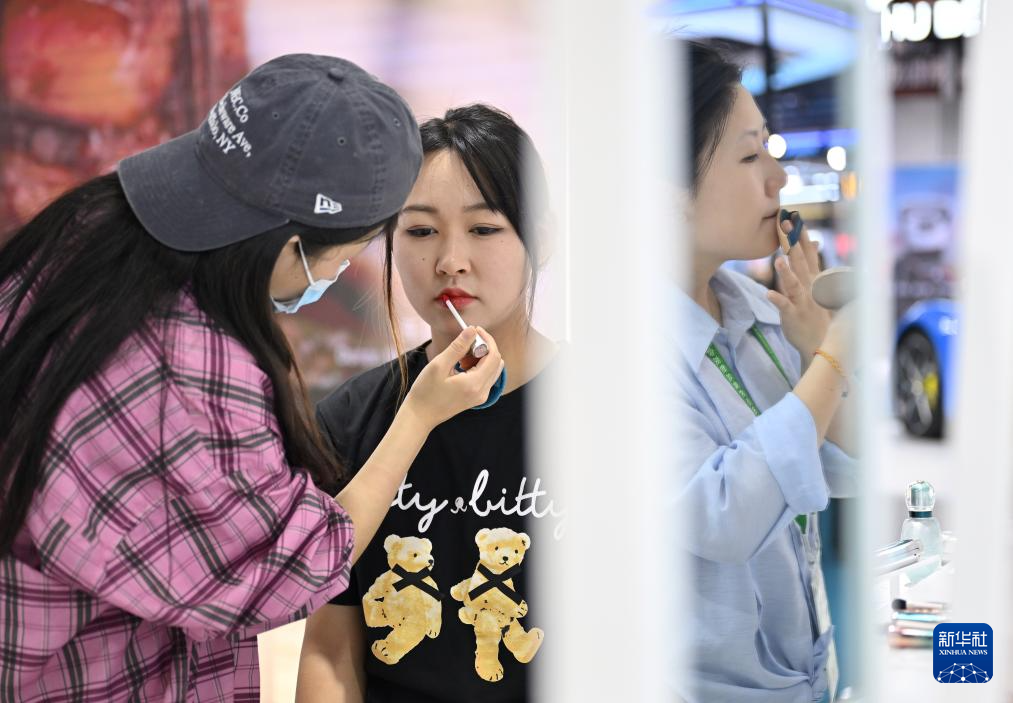 4月15日,觀眾在消博會上體驗彩妝產品。