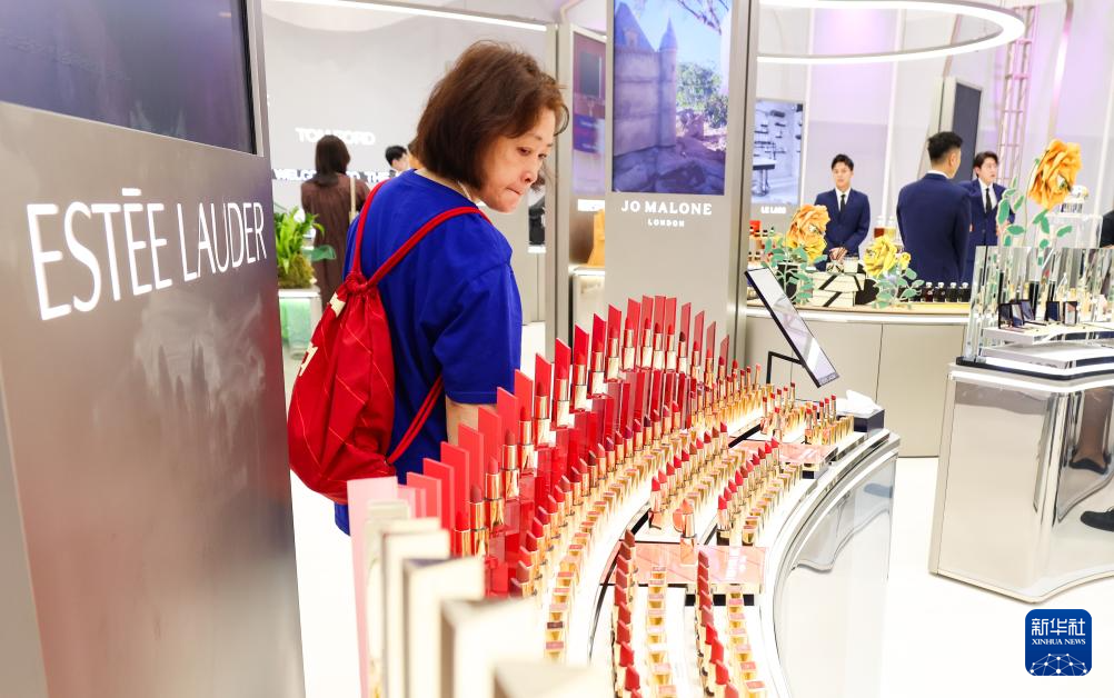 4月15日,觀眾在第四屆消博會上的雅詩蘭黛集團展臺了解產品。