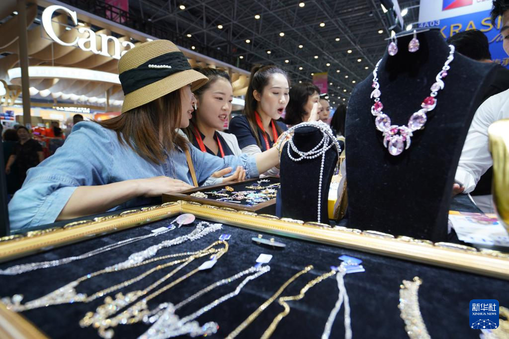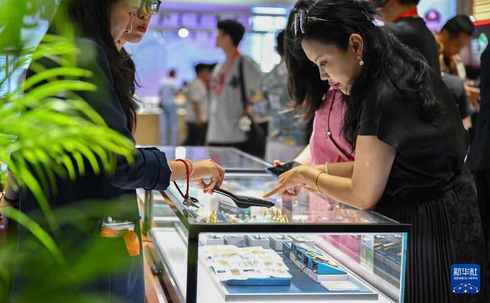 4月15日,參觀者在消博會上選購珠寶首飾。