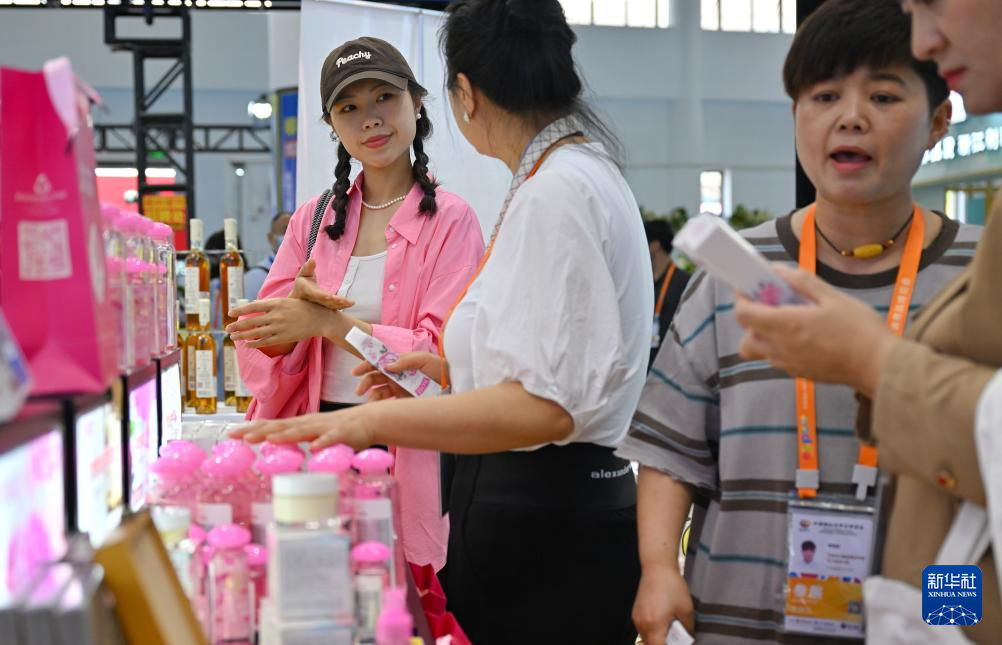 4月15日,參觀者在華熙生物展臺選購護膚品。