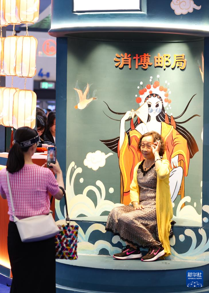 4月15日,觀眾在第四屆消博會上中國郵政打造的消博郵局展區留影。