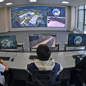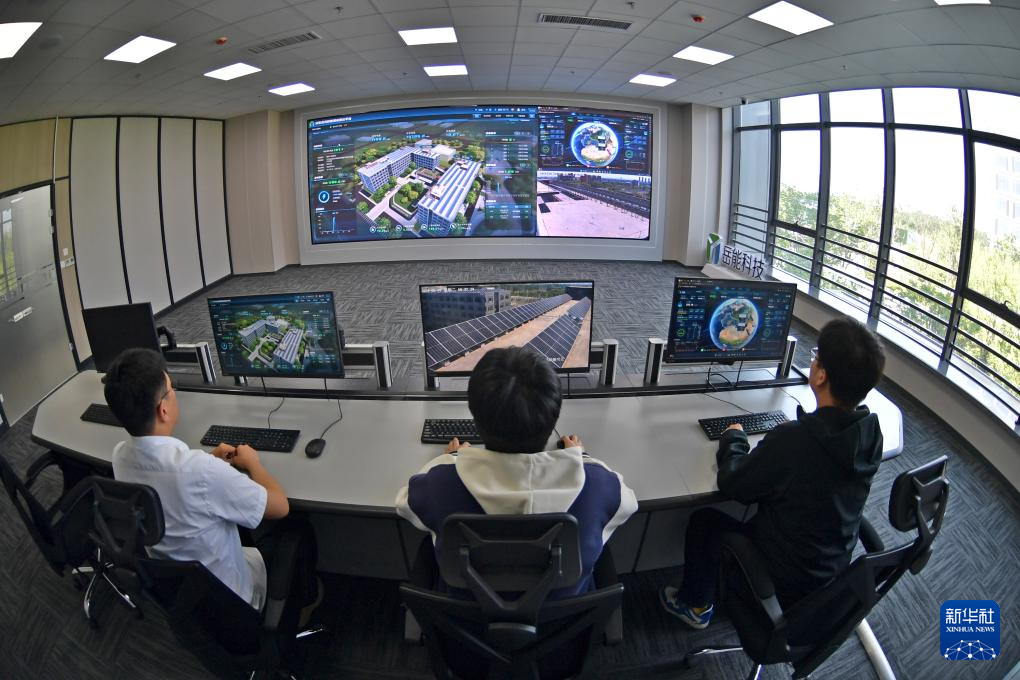 5月7日,在遼寧岳能科技有限公司,工作人員在新能源運行中心進行光伏數據監控。