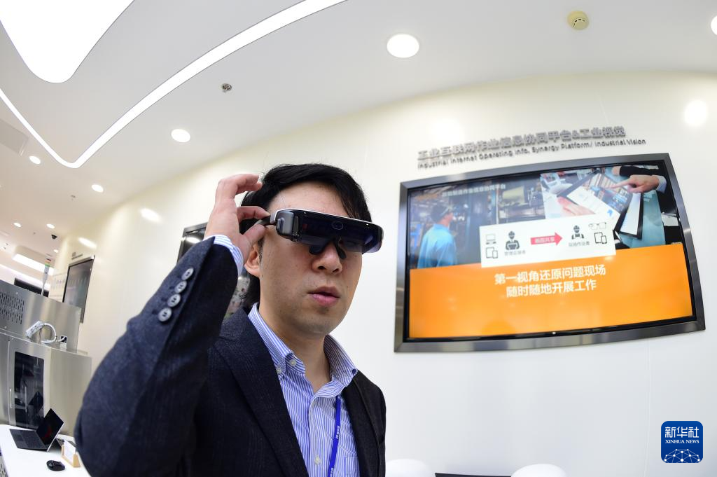在大連信華信軟件園,工程師戴上VR眼鏡,演示工業互聯網作業信息協同平臺的遠距離溝通(4月25日攝)。