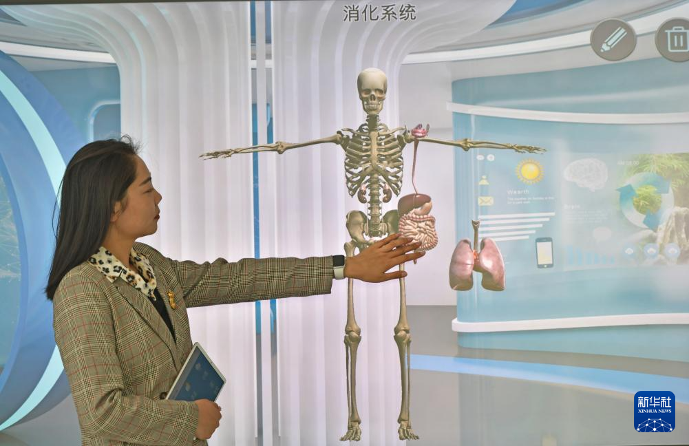 5月7日,在遼寧向日葵數字技術股份有限公司,工作人員進行新形態教材三維立體演示操作。