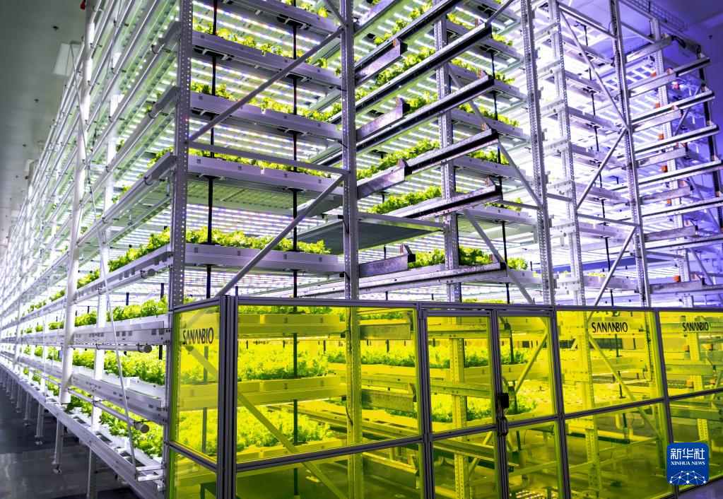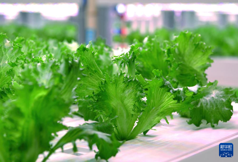 在新一代自動化無人植物工廠的多層植物栽培架上,蔬菜在特殊的LED燈照射下長勢良好(5月8日攝)。